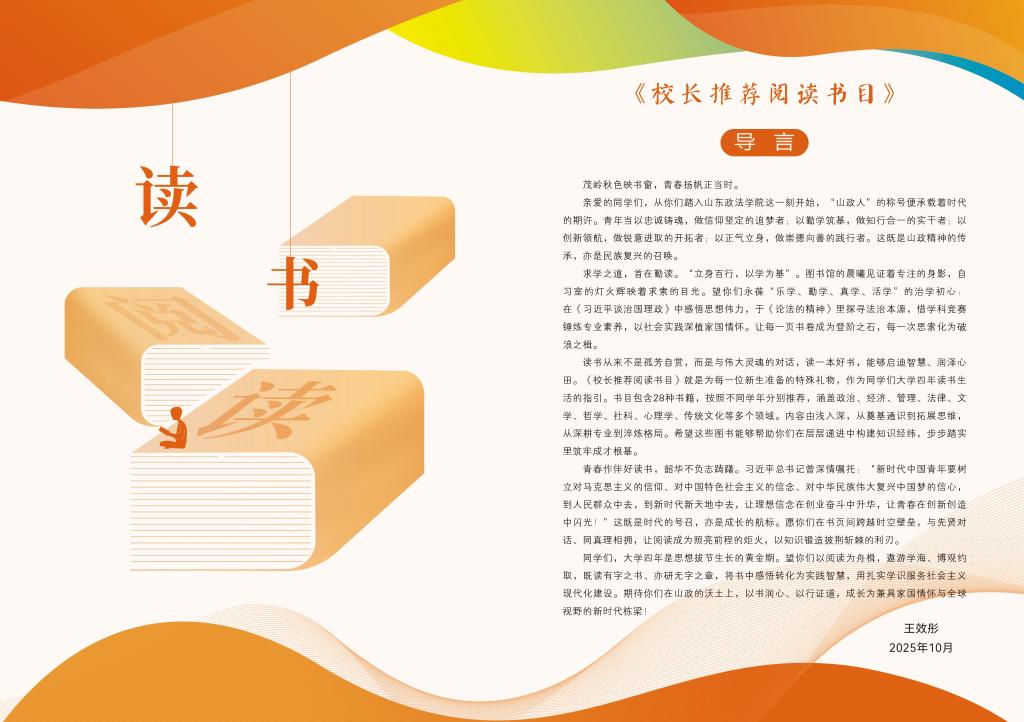 为深入贯彻“文化山政”发展战略,进一步营造浓厚的“全民阅读”校园氛围,扎实推进“书香校园”建设,山东政法学院近日完成并正式推出2025版《校长推荐阅读书目》。新版书目共收录28部经典著作,内容广泛涵盖政治、经济、管理、法律、文学、哲学、社会科学、心理学以及传统文化等重要领域,均为各学科具有代表性的经典文献。
