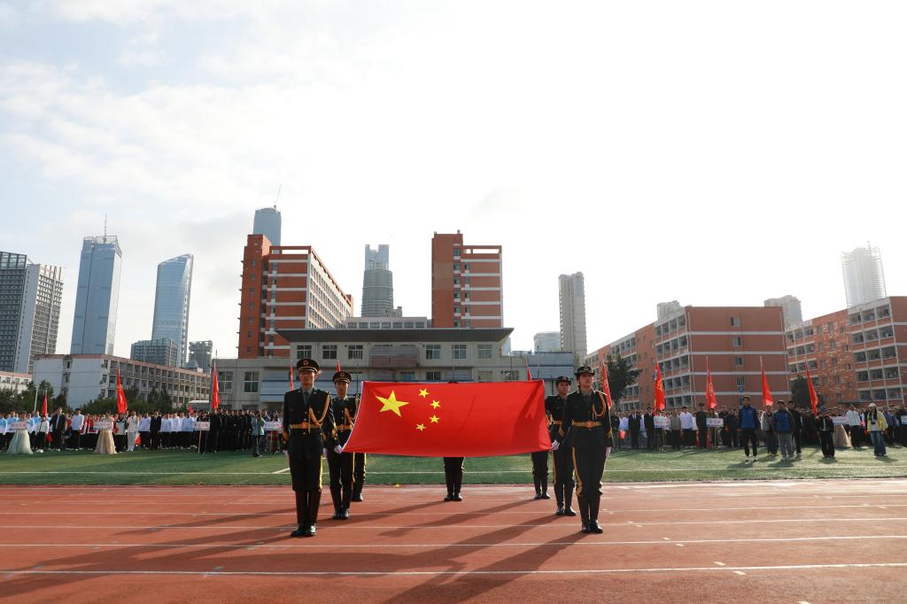 伴着庄严的国歌旋律,国旗手以标准姿势擎举国旗,迈着铿锵的正步,护送国旗走向主席台。全体师生肃立,向国旗行注目礼,齐唱国歌。