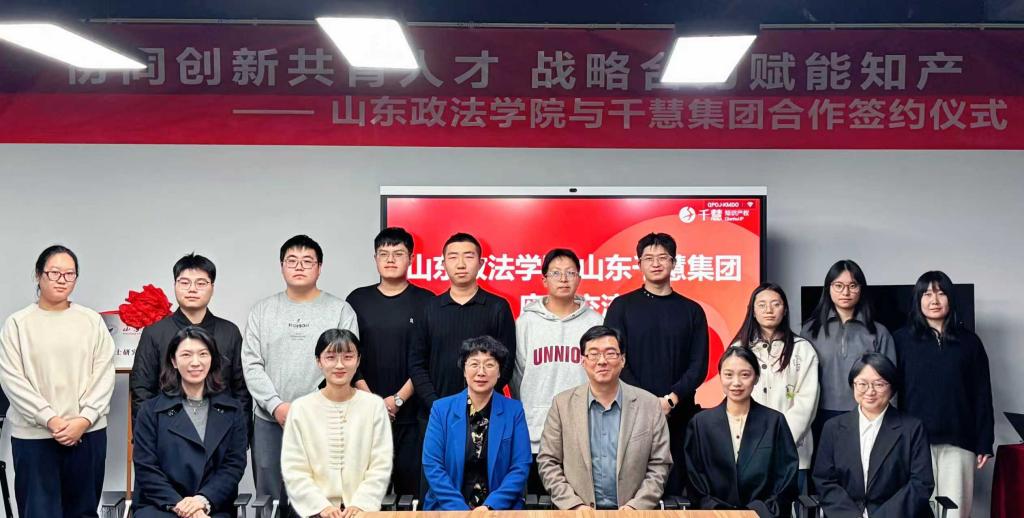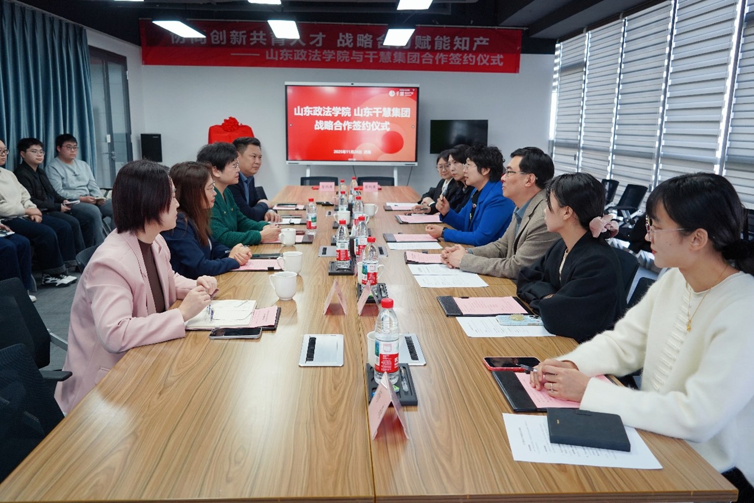 11月28日,山东政法学院党委委员、副院长胡晓清率队赴山东千慧集团有限公司开展校企合作交流。双方正式签署合作协议,并为合作平台揭牌。千慧集团董事长李侠、民商法学院有关负责同志等参加活动。