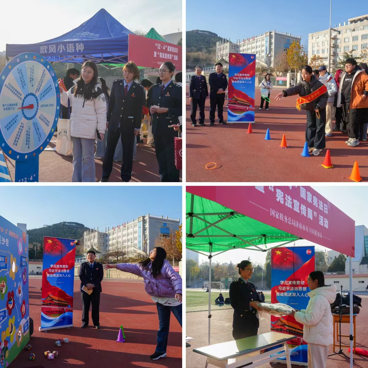 活动现场设置了形式多样的趣味普法环节,将宪法与税法知识融入互动体验,“‘法’盘知多少”转盘答题、“‘法’宝掷必得”沙包投题、“‘法’环套中取”套圈竞答,吸引同学们踊跃参与。活动通过梯度奖励机制,发放实用奖品,有效激发了学生的学习热情。现场气氛活跃、秩序井然,宪法与税法知识在轻松愉快的互动中深入人心。