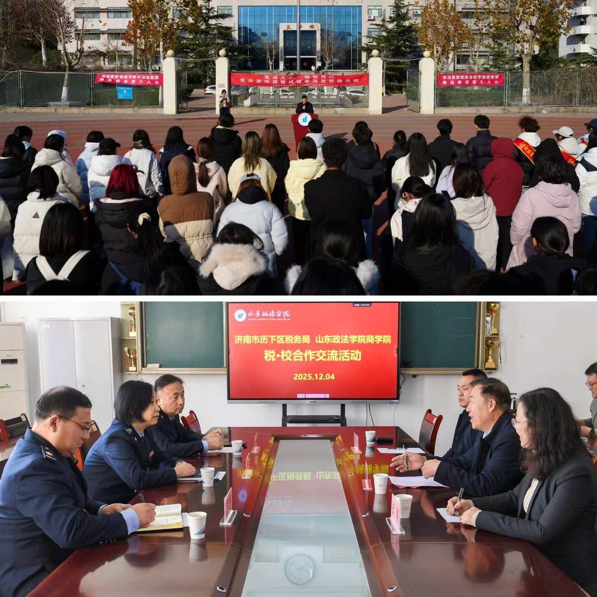 在第十二个国家宪法日暨第八个宪法宣传周来临之际,为深化校园法治文化建设、涵养青年学生宪法精神,12月4日,山东政法学院商学院联合国家税务总局济南市历下区税务局,共同举办“宪法入心·税校同行”宪法宣传周暨税收普法进校园活动。山东政法学院党委委员、副院长林爽,历下区税务局党委书记、局长曲笛出席活动并致辞。历下区税务局党委委员、副局长范玉民、办公室主任贺峰,商学院党委书记刘涛、院长孙建全、副书记苑锦锋和师生代表等100余人参加活动。