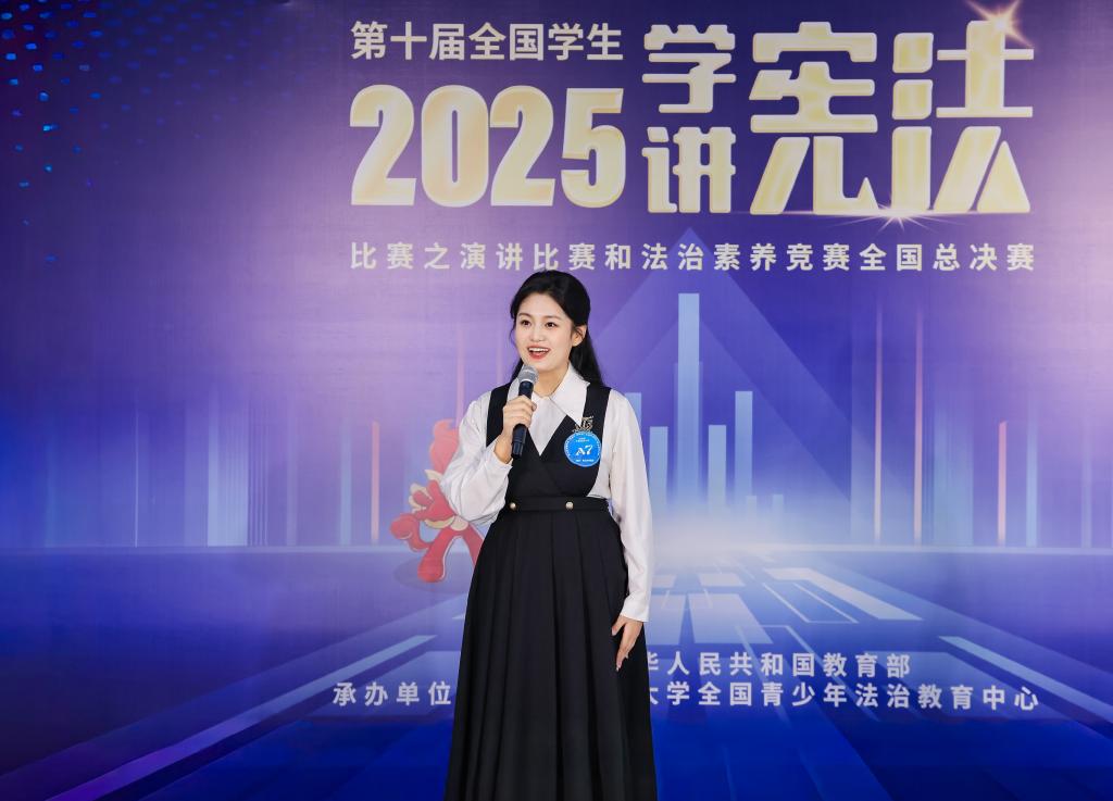 全国总决赛设置主题演讲与即兴演讲两个环节。童予人同学以《以文化之韵传宪法之光,以青年之声扬法治之道》《运动点燃青春炬火,体育铸就强国基石》为题,巧妙融合宪法精神与越剧文化、体育事业,深入阐述了法治建设与中华优秀传统文化、体育强国战略之间相互滋养、协同发展的关系。于菁同学则以《以宪法为纲,铸时代华章》为题,紧密连结警校生的法治信仰与青春追求,深刻诠释了宪法蕴含的时代力量。两位同学的演讲逻辑清晰、语言生动、内容充实,充分展现了新时代大学生对宪法的尊崇与热爱,也生动体现了我校在宪法教育和法治人才培养方面的扎实成效。