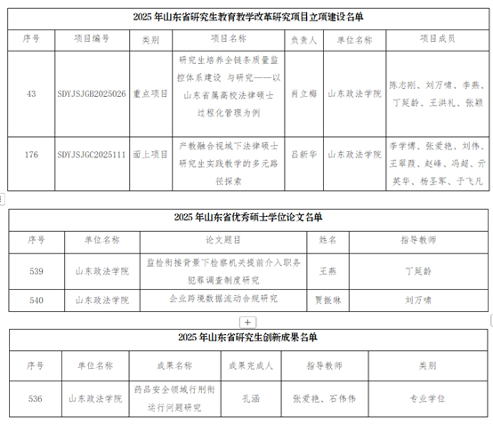 近日,山东省教育厅公布2025年研究生教育相关项目立项等情况,山东政法学院获评教学成果奖(研究生)二等奖1项、省级课程思政示范课程(研究生)1门,获批研究生优质课程立项3门、研究生优质专业学位教学案例库2项、研究生教育教学改革研究项目2项;获评山东省优秀硕士论文2篇、研究生创新成果奖1项。